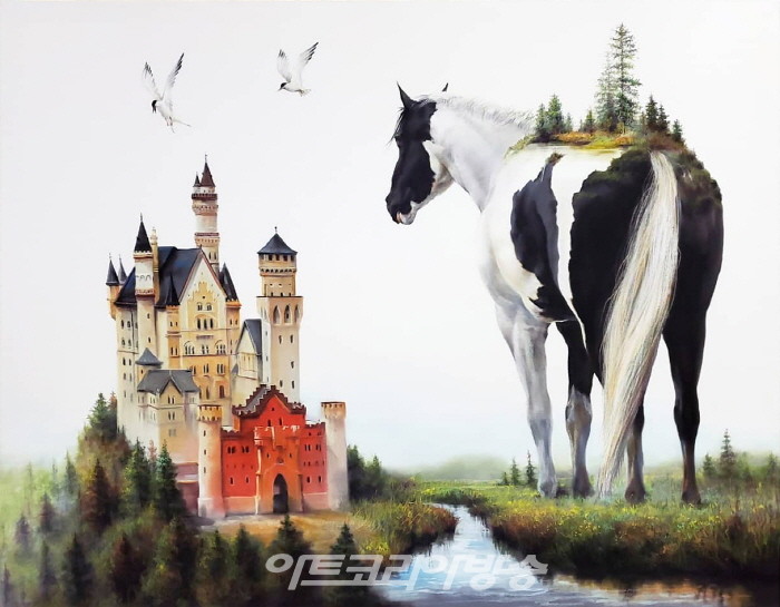 두 번째, 오브제로서 인조털을 사용한 작업은 우선 털을 임의로 캔버스에 부착한 후에 연상되는 이미지를 그려 나가거나 이미지를 그린 후에 인조털을 부착하는 작업이다. 작은 점에서 무작위로 시작된 화면은 서서히 연결이 되고 그 결과 작품이 스스로 풍경이라는 구조 안에서 형성되기 시작한다. 이는 ‘의식의 흐름(flow of consciousness)’이라는 20세기 모더니즘 소설의 특징과도 연결 될 수 있는데, 의식의 흐름을 차용한 기법은 구조적이기보다는 즉흥성을 더 강조한다. 이에는 지속성이 결여되지만 그와 동시에 다양하면서도 복잡할 수 있는 수많은 아이디어들과 마주할 수 있는 기회를 제공한다.