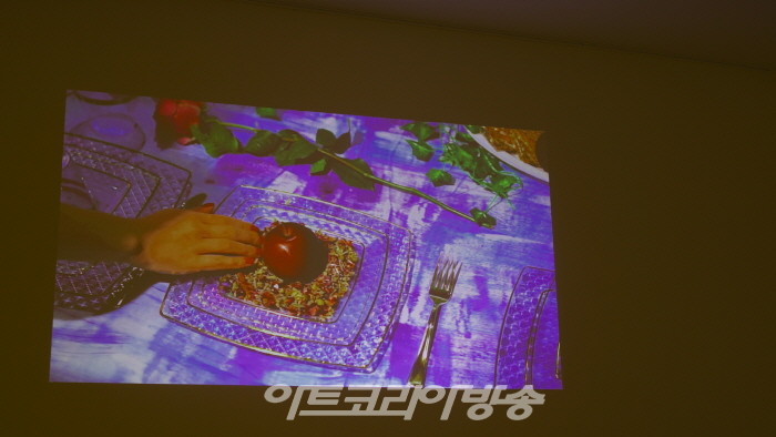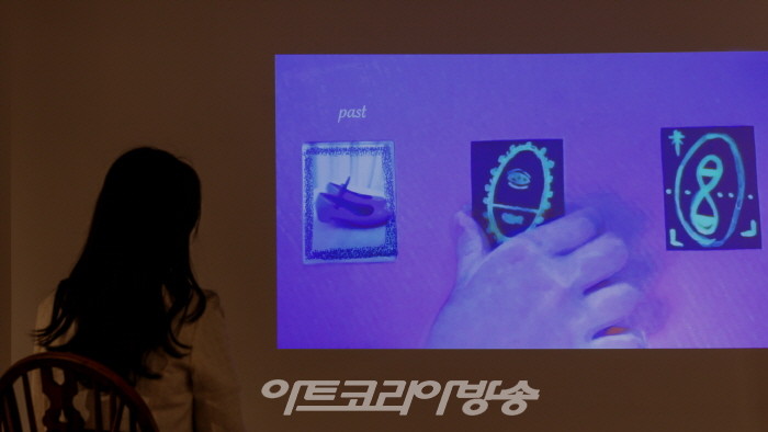 이어진 작품에 대한 질문에서는 “저는 다양한 재료와 혼합하여 작업을 하는데 작업을 할 때 저의 감정과 기억과 제가 나타내고자 하는 나를 가장 잘 나타낼 수 있는 재료를 탐구하고 그러다 보면 여러가지 재료를 쓰게 되는데요. 보시는 영상 같은 거는 제가 퍼포먼스로 제가 겪었던 이야기를 표현하고 제 이야기를 제가 촬영, 편집, 소품을 다 만들어서 하는 거라서 저의 노력이 압축된 작업”이라고 설명했다.
