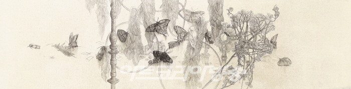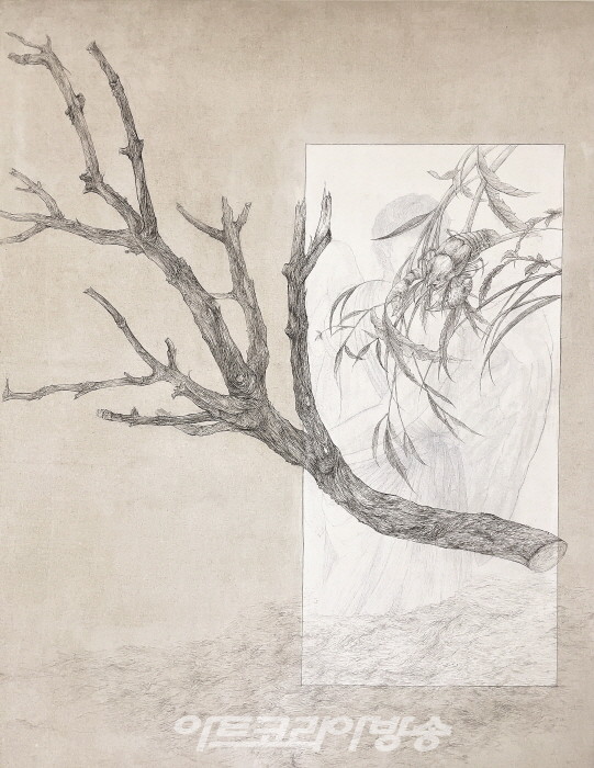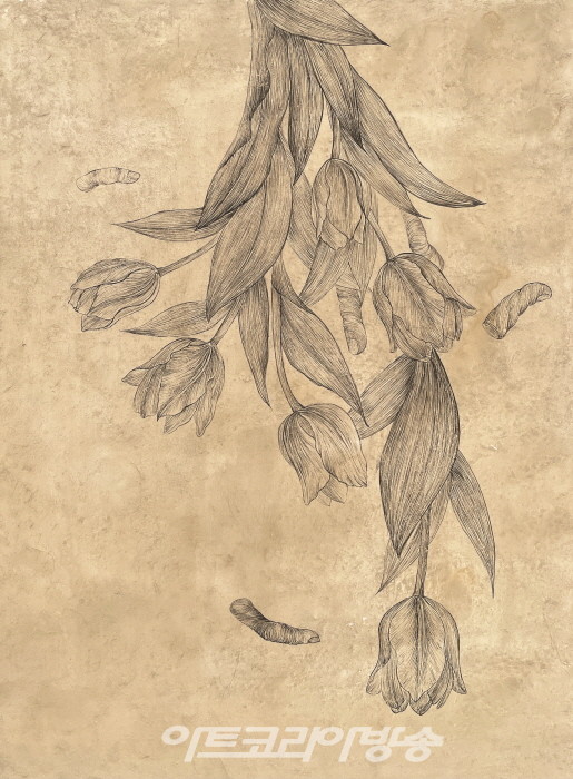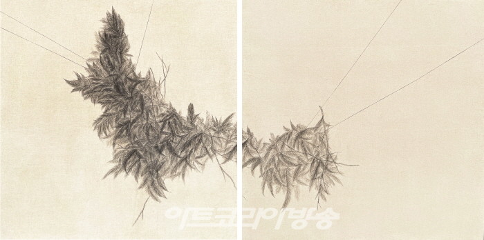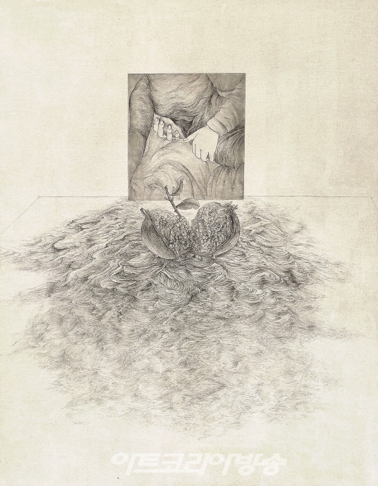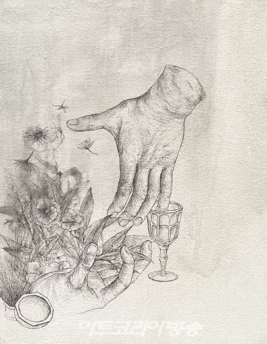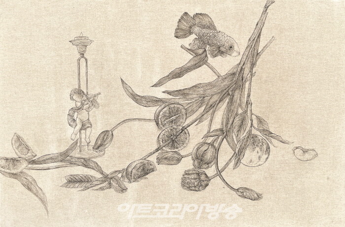 색이 절제되고 흰 화면에 가느다란 획으로 그려낸 형상은 생명의 온기와 습기가 떠나가고 메마른 작은 부스러기처럼 흐리지만 침묵 속에서 분명한 존재감을 드러내고 있다. 용도와 관계없이 배치된 사물들의 조합은 거스를 수 없는 시간에 실려 수많은 타인의 잔해 사이 어딘가에 남겨지는 삶의 끝자락처럼 가볍고 하얗다. 차분히 획을 더하며 사실적으로 그려내는 과정은 의도적인 배치와 구성에도 불구하고 작품에 담긴 이야기로 인해 필연적으로 드러나기 마련인 군더더기를 덜어낸다. 일상에서 동떨어지지 않은 익숙한 사물들이 그려졌음에도 화려하지 않고 절제된 속도의 붓질과 기교를 적극적으로 드러내지 않는 표현으로 인해 작품은 가볍지 않고 경건한 분위기를 조성한다. 쪼개진 과일에서 흘러나온 씨앗이 과육의 점성으로 인해 간신히 매달려 있는 모습은 성모의 품에서 고개와 팔을 떨구고 늘어져있는 피에타를 떠올리게 한다.