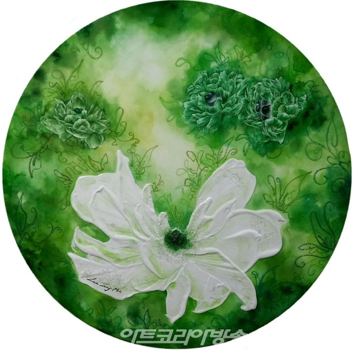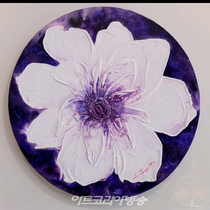 원형의 캔버스에 여러 미디움을 혼합하여 꽃의 입체감을 살리고 한색과 난색의 기운을 모두가진 보라색으로 꽃을 표현 하였습니다. 저의 작품 안 꽃은 사랑과 여인의 아름다움을 상징하는데 원형의 만다라에 우주의 진리가 있다면 나의 원형의 캔버스에는 우주적인 포용적 에너지가있는 모체에 대한 찬미를 담고 있습니다. 보이지는 않지만 존재하는 그런 내면을 작품을 통해 보는이에게 전달되었으면 하는 바람입니다.