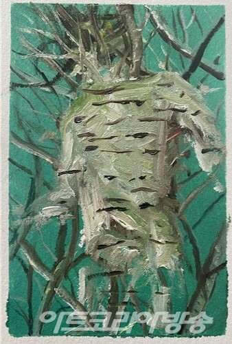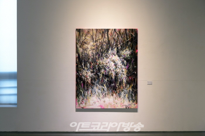 최재영 작가는 ‘몽환적인 풀숲을 바라보거나 조심스럽게 접근한다. 작가는 위생복을 입은 이미지를 그린다. 위생복은 외부로부터 자신을 보호하기 위해 입지만, 상대방을 보호하고 외부 환경을 보존하기도 한다. 긴장감을 유지한 상태의 만남, 서로를 알아가는 늘 조심스러운 순간이다. 미지로 들어가 접촉을 시도하고 그 너머에 무엇이 있는지, 그리고 나는 무엇을 할 수 있는지 탐구하는 과정이다.’