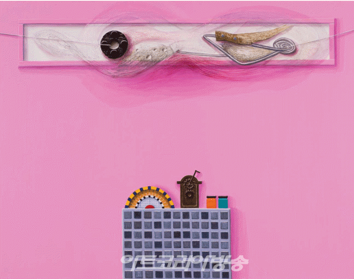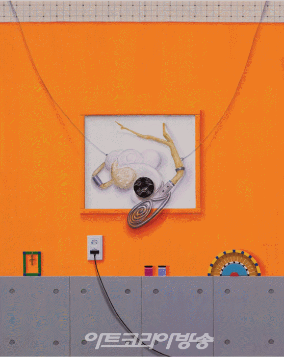 이를 표현함에 있어서도 회화적(그리기)이면서 조각적(질료를 붙이고 긁어내기)인 방식이 서로 맞물려서 진행된다. 여기에서 흥미로운 점은 결과적으로 드러나는 저부조적(bas-relief) 공간(표면)이 시각적 착각으로 인해 재현적으로 인식되지만 작업에 있어 결코 재현적으로 접근하지 않았다는 점이다. 작업 과정에 있어 사전 드로잉을 통해 상상(환원적)의 산물을 그린 것이며 작업하는 가운데 우연과 흔적을 수용하며 수행적으로 접근하였다. 또한 이질적인 질료의 층위들(아크릴 층, 리퀸 층, 오일 층)을 축적함으로 점진적인 구축을 통해 저부조적 표면을 드러낸 것이다. 이는 존재 그 자체에 대한 고유성을 사유하는데서 비롯된 것이다. 이렇듯 본인은 지배적인 단일한 세계가 아닌 이질적인 세계의 상호적 만남에 대한 흥미가 있고 이에 대한 배치 방식을 연구하며 또 다른 세계와 존재 가능성을 탐구한다.