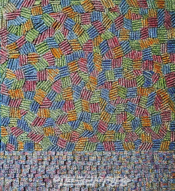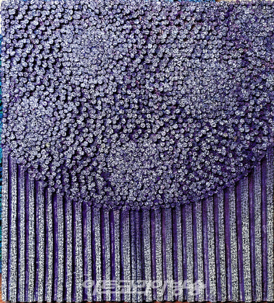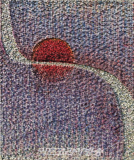 "헤아림의 꽃길"은 보라 덩어리가 사각의 평면을 채우며 잠자고 있던 지구가 지녀온 기억의 두께가 생동감 넘치도록 뜨겁게 분출하여 지구의 기억이 용솟음치고 있는 형상이다. 그것은 마치 각기 다른 지구 만물의 생명이 가지고 있는 담론의 고유한 향연이 우아한 조화를 이루며 우주에서 작용하고 있는 거대한 질서의 아름다운 화음을 보여 주고 있다. 또한 폭발하는 각기 다른 기억의 많은 생명체가 폭발하며 하나가 되어 우주질서에서 벗어날 수 없음을 의미하며, 즉 자연의 순리대로 살아가는 것이 아름답고 우아하다는 의미부여를 표현한 작품이다.