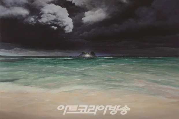 이번 전시의 제목은 < 기묘한 그러나 아름다운 >이다. 제목에서 알 수 있듯이 작가의 풍경은 현실과 초현실의 중간 어디쯤에,,,,로 보여진다. 또한 작품 안의 시간도 여러 시간이 공존하고 있다. 빛에 의해 다르게 보여지는 새벽과 어스름한 늦은 저녁은 한 작품 안에서 경계를 알 수 없는 공간과 공간이 마주하여 새로운 시공간으로 보여진다.
