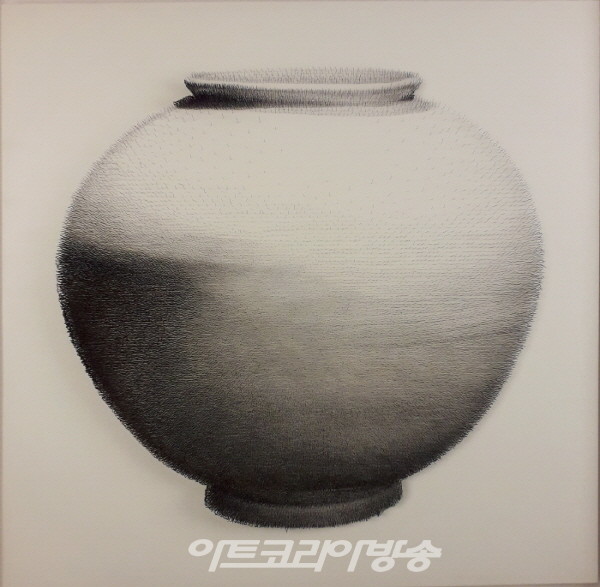김덕용이 나무로 달항아리를 구현해낸 데 번해, 김용진은 철사로 구현해 놓았다. 수만개가 넘는 철사를 꼬아서 하나하나 일일이 심어서 달항아리를 평면스러운 입체로 재현한다. 심은 철사의 밀도가 명암을 조성해서 마치 흑백 사진이나 검은 색 안료로 그린 그림처럼 보이지만, 눈의 착시에 따른 일종의 부조다. 도자기 형상처럼 보이지만 그것을 제외하고는 도자기와 아무런 상관이 없다. 달항아리의 이미지가 그 재료적 물성에서 독립하여 스스로 그 존재감을 드러낸다.