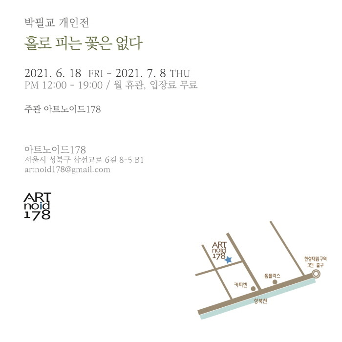 [아트코리아방송 = 김미영 기자] 서울시 성북구 삼선교로6가에 위치한 아트노이드178에서는 2021년 6월 18일 – 7월 8일까지 박필교 작가 개인전 '홀로 피는 꽃은 없다'가 전시된다.