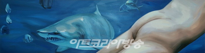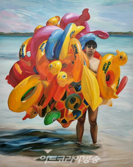 이전 전시 <상냥한 도살자>(개인전, 2019), <존은 뒤에 가서 죽는다>(단체전, 2020), <떠들지 않는 사람은 위험하다>(단체전, 2021) 등에서 보여주었던 작가의 블랙 유머는 이번 전시에서도 작가의 고유 시그니처로 유감없이 발휘된다. 놀이공원, 해변 등 통상 인파가 몰리는 일상 공간에서 홀로 벌거벗고 서 있는 남자의 몸은 우스꽝스럽다 못해 얼핏 안쓰러운 느낌마저 든다.