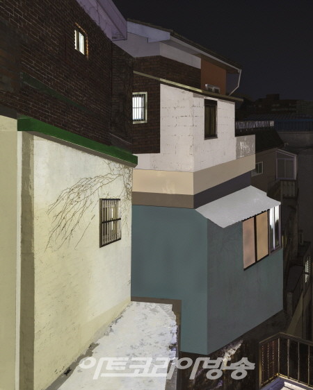 가능한 자신의 정면을 가감 없이 보여주고 있는 이 정직한 집은 가장 기본적인 집의 외관과 구조만을 뼈처럼 드러낸다. 지붕과 벽, 창문 이외의 다른 장식은 거의 없는 집이다. 도로나 길가와 인접한, 그렇게 무방비로 노출된 집들은 출입구를 숨긴 체 밋밋한 벽만을 창백하게 보여줄 뿐이다. 다만 몇 개의 창이 있고 외부의 시선과 접촉으로부터 보호하기 위한 구조물이 창문으로 붙어 일종의 방어벽을 만들고 있다. 이 어설프고 불안한 시설물은 기능적인 역할보다는 심리적인 방어기제로 작동하는 편이다. 기이한 색상의 페인트로 칠해진 벽은 그만한 강도를 지닌 지붕 색과 강렬한 대조를 이루면서 너무 얇고 평면적으로 펼쳐져 있다. 벽은 그 집에 사는 누군가의 등을 연상시킨다. 혹은 타자의 시선에 대책 없이 드러나 버린 살처럼 민망하면서도 관능적으로 빛난다.