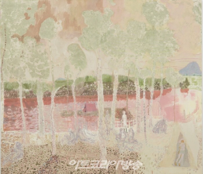 Andrew Cranston은 1969년 영국 하윅 출생으로 스코틀랜드 화가이다. 그는 우리의 시간 감각을 불안정하게 만드는 전달적인 이미지를 만든다. 작품은 보는 이로 하여금 향수와 꿈의 영역 사이의 공간을 탐험하게 한다. 조밀한 기름 얼룩이 디스템퍼의 세척액 위에 스며들어 두텁고 얇은 안료 층을 통해 보는 사람의 눈을 안내한다. 먼 곳, 아마도 상상한 기억에 대한 애절한 시학에 불을 붙인 Cranston의 삽화는 끊임없는 시간의 리듬에서 자신을 제거한다. ‘종을 기다리며’의 이미지는 경계의 상태, 즉 알람이 현실로 돌아가기 전에 꿈에 매달려 있는 느낌을 연상시킨다.