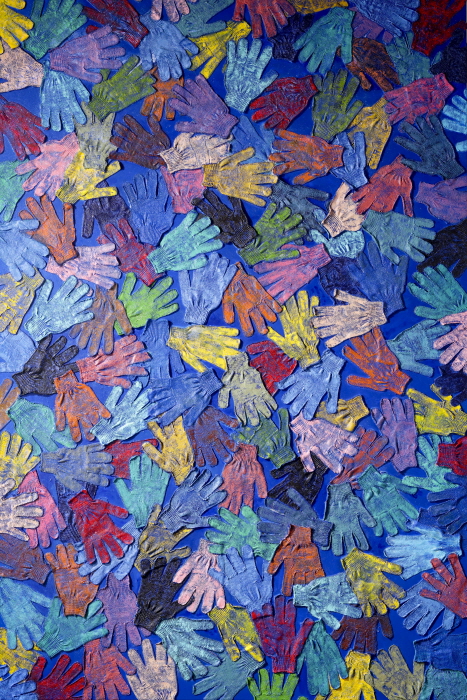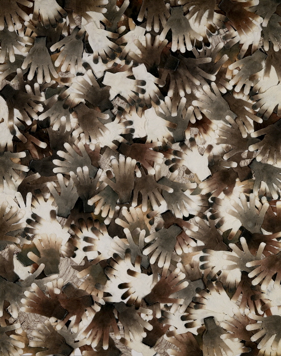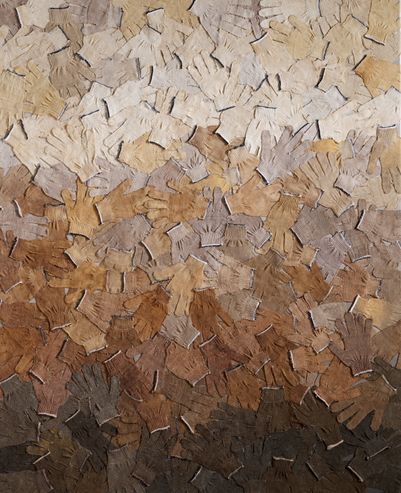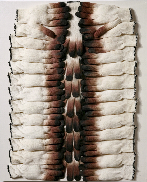 이어 “그래서 어울려서 함께 인생을 살아가는데 많은 그 기원을 담고 평화, 봉사, 사랑, 배려 이런 것들을 담아서 작업용 면장갑을 염색하거나 이어 붙이고 때로는 손가락 부분을 늘리거나 변형해 자신의 이야기는 물론 자연의 생성, 변화, 소멸 과정을 표현하는데 면장갑이 무엇보다 서민적인 소재여서 마음에 든다는 그는 손을 보호하는 장갑이 마치 사람들의 아픔을 따뜻하게 감싸주는 것 같다”고 말했다.