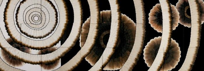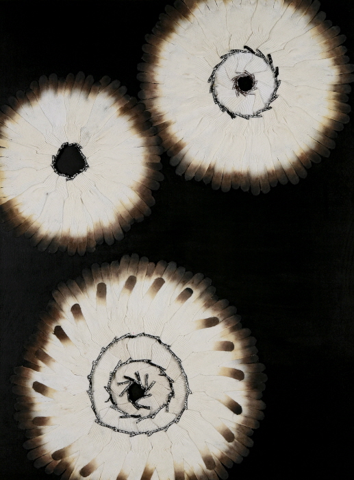 정 작가는 “모든 인생살이가 점에서부터 시작해서 점, 점, 점이 모여서 선이 되고 그 선들이 모여서 형태가 되듯이 특히 제 80년도, 90년도, 2000년도 작품을 보면 블랙홀시리즈같이 장갑 끝이 골드핑거에요. 골드핑건데 많은 작품들이 무제 시리즈, 어울림 시리즈, 블랙홀 시리즈, 또 하모니, 골드핑거 이런 식으로 끝이 까맣거나 흰 게 많습니다.