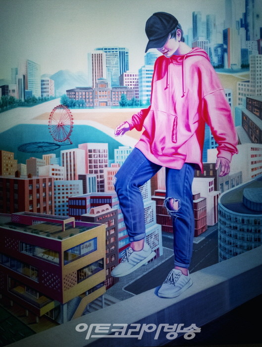 한편, 김경옥의 많은 작품 속 등장인물은 때론 웃거나 슬며시 미소를 드러내기도 하지만 대개는 감정 상태가 어떤 것인지 확인하기 어려운 미묘한 ‘중성성’, 그것도 ‘불안한 중성성’의 상태를 드러낸다. 그것은 ‘웃고 있어도 웃는 것이 아닌 이십대’의 불안정한 정체성과 상황을 어김없이 드러낸다. 이번 전시에서 선보이는 다수의 이미지가 그러하다. 아슬아슬하게 옥상 난간 위를 걷는 위험한 모험에 탐닉하는 청년, 수많은 길 앞에서 방향을 잃은 듯 서 있지만 확고한 의지를 표현한 뒷모습, 알수 없는 비정형의 상황 앞에서 무엇인가 찾고 있는 뒷모습 등 다소 해학적인 표현에 이르기까지 작품 속 등장인물은 불안한 중성성의 상황을 연출한다. 대개 그것은 무표정, 무관심의 상태이거나 양자를 혼성하는 ‘교착 혹은 균형(standoff)’이 혼성된 중성성의 상태로 가시화된다. ‘침체/평온'이나 ‘고요/우울’이 그리고 ‘번민/설렘’ 혹은 ‘불안/흥분’이 뒤섞인 채로 말이다. 가히 ‘불안한 중성성’이라 할 만하다.