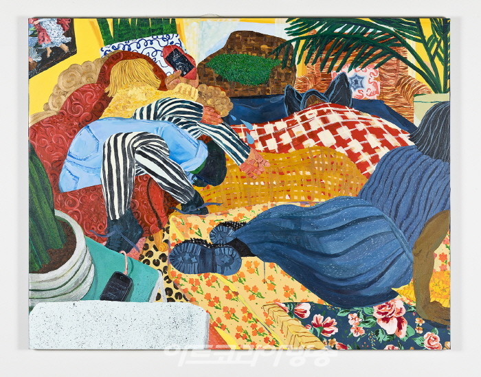 다이어의 작품에서 특징적인 또 하나의 요소는 얼굴을 드러내지 않는 인물들이다. <Studio HH>(2017), <Mario Kondo>(2019), <Girl Talk>(2019) 등에 등장하는 인물들은 회화 속 공간을 함께 점유할 뿐 각자의 세상에 골몰한 모습이다. 하물며 <Girls Talk>를 제목으로 하고 있는 작품에서조차 인물들이 실제로 대화를 나누고 있다는 느낌을 받긴 어려운데, 이는 관람자로서는 그들의 시선이 어디를 향하고 있는지, 과연 서로를 향하고 있는지 도통 알 수가 없기 때문이다. 의도적으로 두상을 잘라내거나 등을 지고 있는 자세로 그려진 다이어의 인물들은 얼굴을 맞대고 있는 때조차 스마트폰 화면에 집중하는 모습으로 자주 나타난다. 오늘날 우리가 살고 있는 이곳에서도 흔히 만날 수 있는 그러한 풍경은 동시대인들이 호소하는 ‘군중 속 고독’을 현시한다.