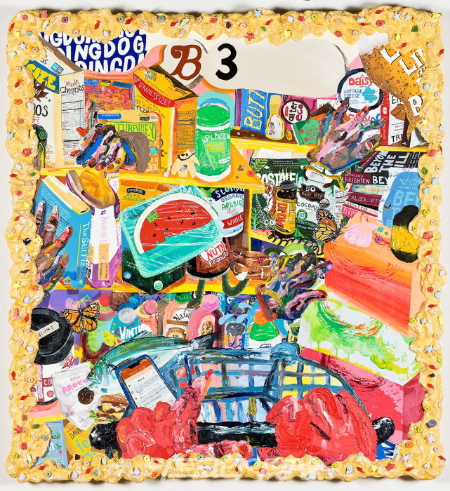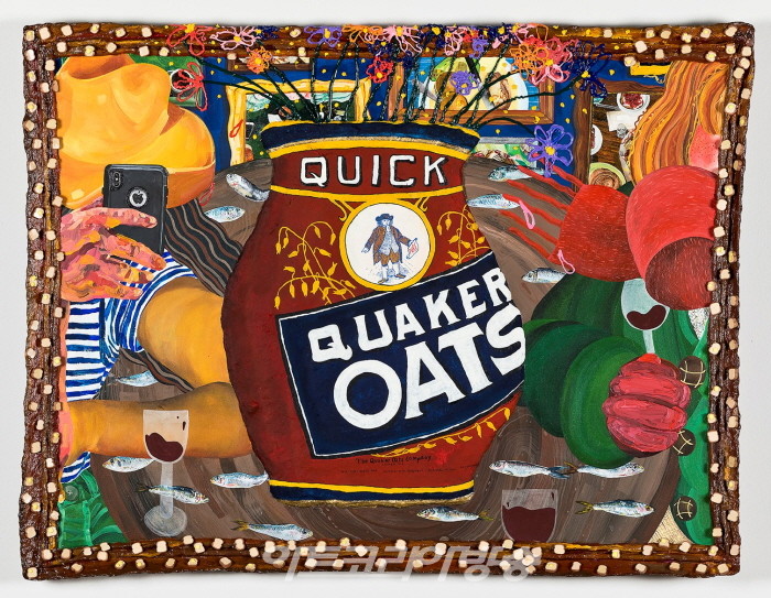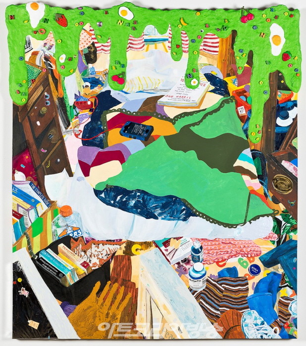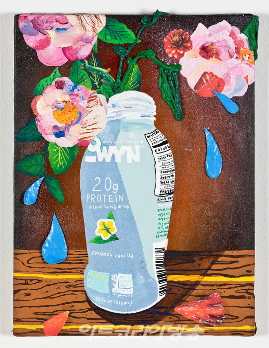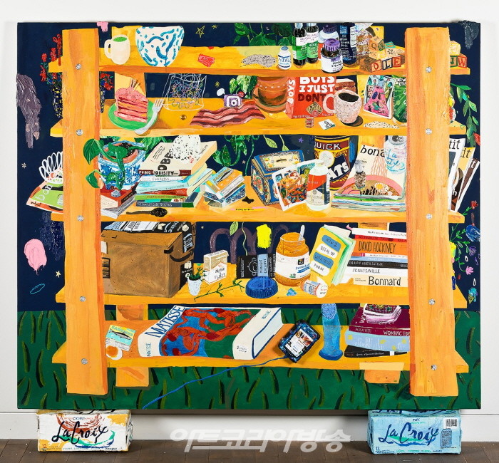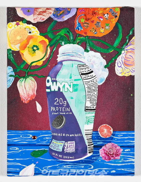 정물로 인생의 문제를 표현하는 전통은 17세기 네덜란드 바니타스(Vanitas) 회화에서 유래한다. 진기한 과일, 음식, 유리잔, 꽃 등을 해골, 촛불 등과 함께 한 화면에 배치하는 바니타스는 인생무상을 의미하며, 지금-여기 인간에게 만족감을 주는 모든 것이 결국엔 죽음으로 사라져버린다는 메시지를 담고 있다. 여행 중 우연히 마주친 바니타스 회화에 매료된 니콜 다이어는 이를 현대적인 언어로 차용해 몇 세기 전 사람들이 겪었던 과욕과 과용의 문제가 오늘도 변함없이 이어지고 있음을 말한다. 예컨대 <I Have It All but I Still Want More>(2019)은 제목에서부터 그러한 작가의 의도가 표현되고 있다. 다양한 합성재료를 혼합해 만든, 마치 과자 같은 테두리 안에 들어찬 사물들은 하나같이 먹음직하고 보암직하다. 그러나 하나씩 떼어 보면 잠깐의 만족만 줄 뿐 결코 인간에 이롭지 못한 것들이다. 그럼에도 불구하고 그림 속 손들은 이것도 저것도 탐하는데, 이는 끝내 만족함은 없으리라는 적막한 예감을 지시한다. <My Pantry>(2018), <Pearl’s Room>(2019) 역시 이와 같은 주제의식을 공유한다.