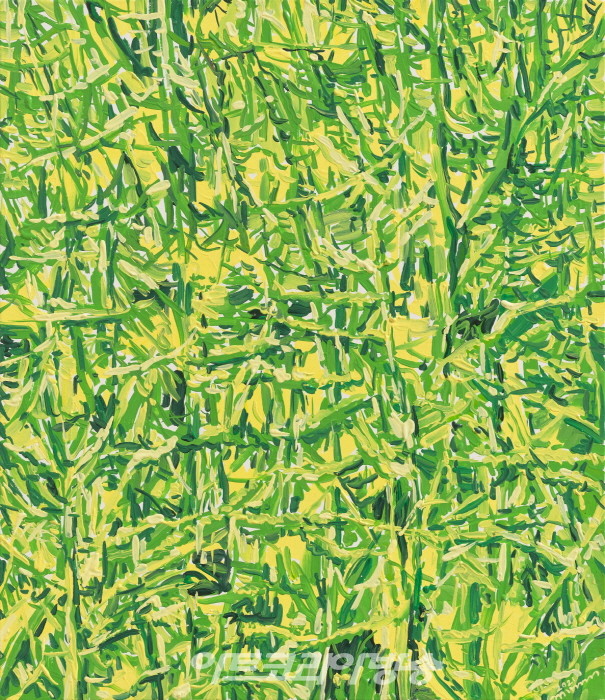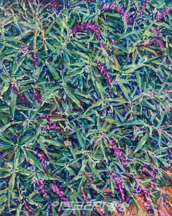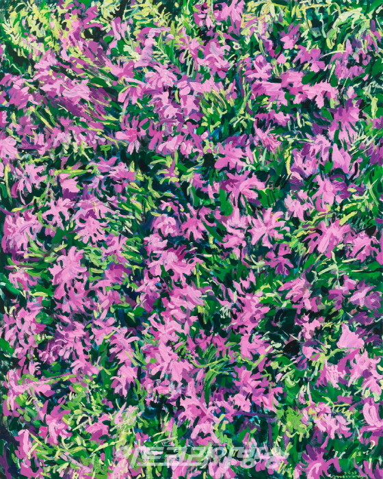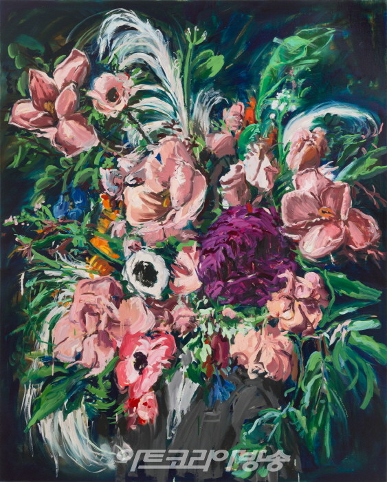 작가의 붓질은 그러나 이들이 꽃-다움이나 줄기-스러움을 애써 인식하지 않는 것처럼 무심하거나 무던하다. 무엇보다 붓놀림의 속도감때문에 꽃그림 특유의 매만지는 듯한 애착이 배제되어 있어 상쾌하다. 굳이 꽃의 생물학적 조건이나 또는 인문학 적 상징, 그로 인한 감상적 영역에 접근하지 않아도 되는 것이 홀가분하면서, 내 감정의 자유를 허락하는 의미의 공백이 다행스럽게 느껴진다. 회화적으로는 원근 이 억제되고 공간에 대한 설명이 없기 때문에 색감 위주의 패턴이나 추상화과정 으로 단순화 될법도 한데, 화면을 종횡무진하게 달리고 뻗고 호흡하는 에너지의 기세 때문에 결국 ‘흐드러지게’ 핀 꽃그림임이 드러난다. 새롭게 발견된 꽃그림이 반갑다