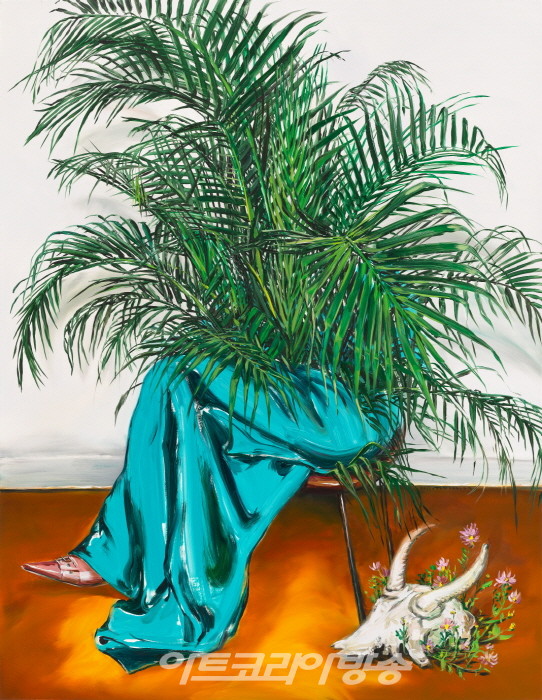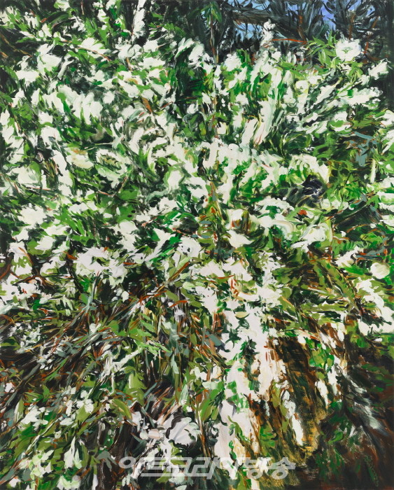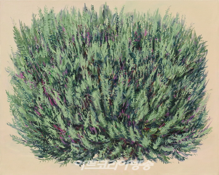 오랜 미술의 역사를 생각할 때, 익숙한 회화장르에서 익숙함을 앗아가는 능력은 값진 재능이다. 아무리 포스트모던이다, 미술사에 새로운 것은 더 이상 없다, 자 포자기한 듯 말해도 과거의 답습이나 심화만으로는 (대중의 사랑은 받을 수 있을 지 몰라도) 비평적으로 두각을 드러내는 작품이기는 힘들다. 허보리의 꽃그림들은 꽃을 주제로 삼고는 있지만 ‘꽃그림’이라 부르기에는 진화된 새로운 지점을 찾아 나선다. ‘능래역1’(2020)과 ‘능래역2’(2020) 모두 지역명이 제목이지만 화면은 ‘흐드 러지게’라고 표현하는 것을 기다리는 듯한 꽃과 이파리들로 꽉 채워져 있다.