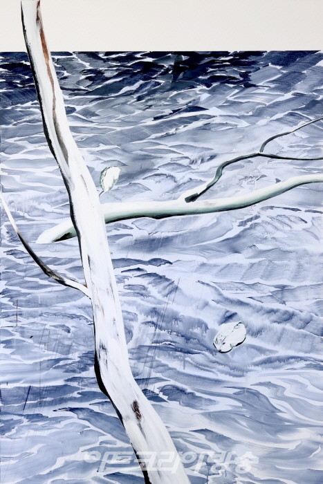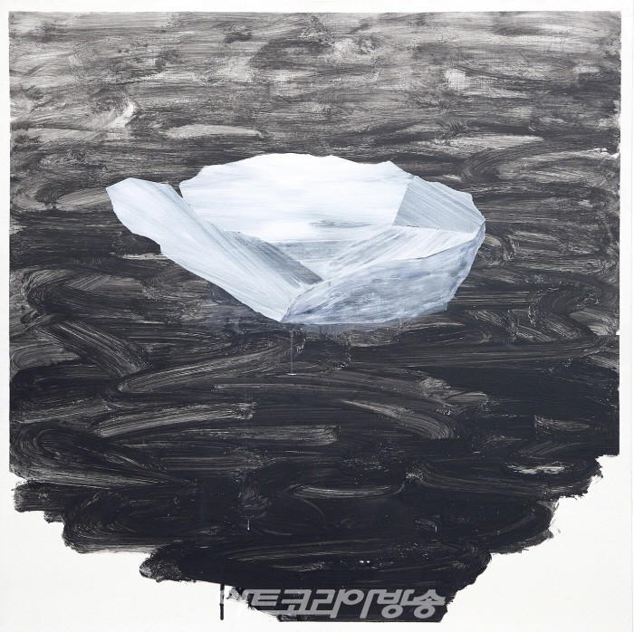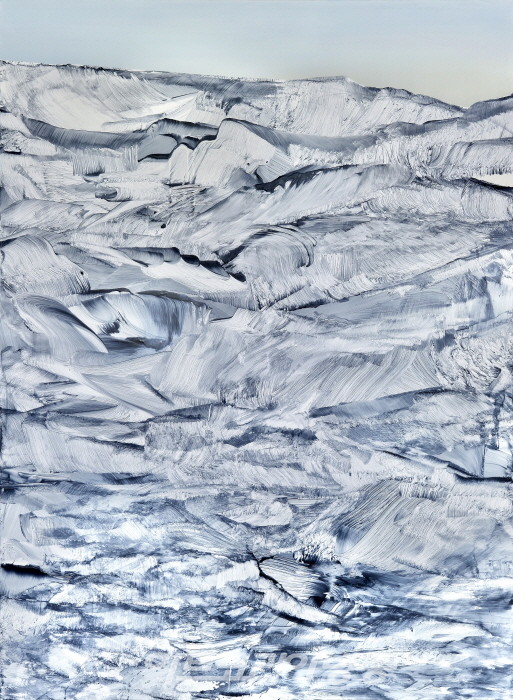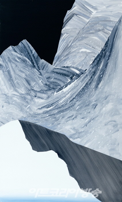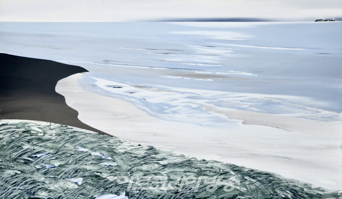 한지희 작가의 화폭에서는 깎아지른 절벽, 바다, 빙산, 바위 등 사실적인 풍경으로 보이지만, 실제로는 존재하지 않는 천상의 순수한 경관들이 펼쳐진다.