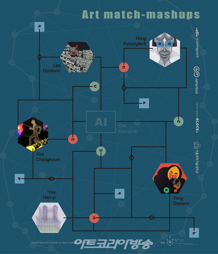 전시의 타이틀인 <아트 매치-매시업Art match-mashups>은 시각예술을 공통 분모로 작가의 자유로운 창작품과 그 창작 기술을 학습한 인공지능이 제작한 작품(생성모델 결과물)을 단계별로 비교 검토하고 최종적으로 인간과 인공지능의 만남을 통한 새로운 창조적 가능성을 시현한다는 융복합 프로젝트의 의미를 압축해 준다. 이는 ‘여러 자료에서 요소들을 따와 새로운 노래·비디오·컴퓨터 파일 등을 만드는 ’매시업(Mashup)처럼, 인간과 인공지능을 넘나들며 개성이 담긴 다양한 창작 정보(콘텐츠)와 테크놀로지를 교환·혼합·응용함으로써 새로운 유형의 창작물을 개발한다는 것이다. 그 과정에서 인공지능은 예술가 고유의 창작 기법과 작품 내용의 진술 등을 빅데이터로 학습하여 콜라주 형식의 인공적 작품을 만들어 내고, 작가는 이를 토대로 새로운 아이디어와 모티브를 도출하여 공통의 학습 과정이 포함된 최종 작품을 창작하는 변증적 실험의 장을 전시로 구성함으로써 인공지능과 예술가의 창작활동 성과를 평가한다.