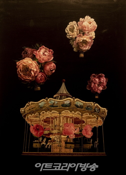 지친 현실을 등지고 도망치거나 사라지고 싶었을 때, ‘각박한 상황 속에서 우리는 왜 버티며 살아가는 것일까?’ 물음을 지니게 됐고, ‘사람을 살아가게 하고 힘든 시간을 견딜 수 있게 만드는 마음은 어디서 나오는 것일까?’라는 좀 더 세부적인 고민을 하게 됐고, ‘꽃 열기구’를 타고 주마등과 같이 머릿속을 스쳐 지나가는 -추억 속 공간, 현재, 가상의 공간, 꿈속 - 공간을 무한정 여행하며 행복하고 희망으로 가득했던 순간을 떠올리고 상상하며 얻어가고 있다.”고 답했다.