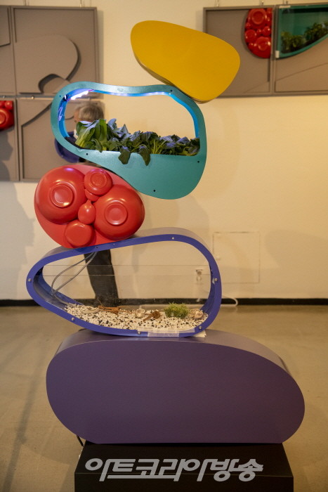 이어 이 작가는 "이 작품은 면의 선이 분할된 것이 아니라 다른 곳에 있었던 것이 떨어져서 헤체되어서 다시 재구성된 작품이며 제 개인적인 작품도 원래 식탁, 식당 그런 곳에서 먹는 도구로서의 기능적 역할에서 떨어져 나와 이 작품에 재 구성되면서 호박이나 다른 동물적인 형태의 조각품으로 이루어 지듯이 스마트팜과 제 작품이 헤체와 재구성이라는 것에 슬로건을 두고 작업을 진행하게 되었다."고 말했다.