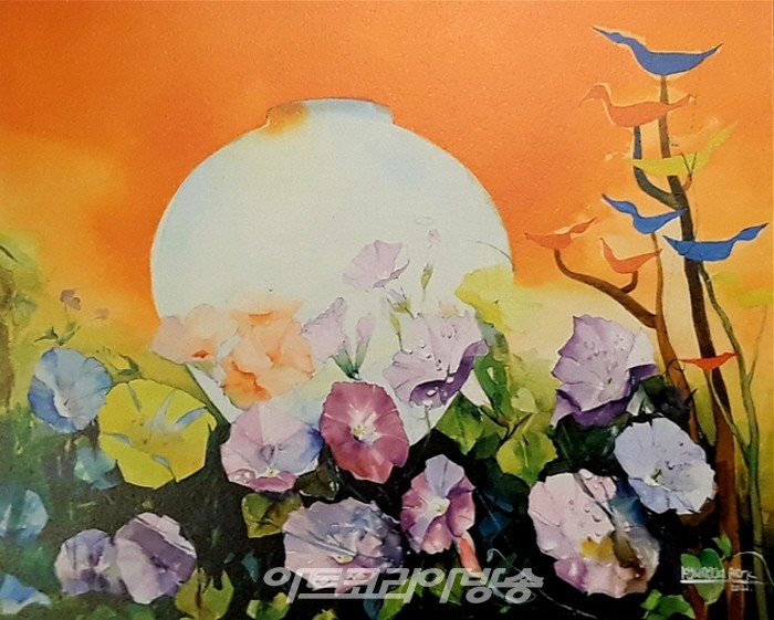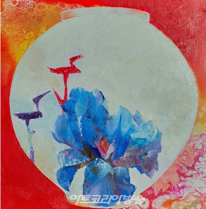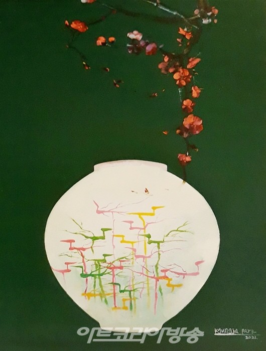 <기원 21> 2021 작품을 보면 단순하고 추상적인 배경(wet-on-wet)과 달항아리와 솟대, 복잡하고 사실적인 나팔꽃(기쁜 소식)의 소재로 구성하여 자유로운 느낌으로 대범하게 붓질하여 극적인 효과로 표현하고 있다. 밝은 보름달처럼 달항아리의 의미는 현실과 초현실 사이로 열린 창이다. 작가는 이성과 감성, 정신과 마음이 합치는 지점에 그 초점을 맞추고 현실적인 연상을 뛰어넘는 불가사의한 것, 비합리적인 것, 우연한 것 등을 표현하여 보는 이로 하여금 상상적 공간이며 비현실의 공간으로 머물게 한다. 작가는 기원이 담긴 내면의 의식을 색과 형태(이미지)로 담아내는 메타포적 언어의 예술로 승화된다. 내면의 스펙트럼처럼 의식의 차원 너머에 무의식(비합리적이고 알 수 없는 영역)과 연결하게 한다. “나는 내가 존재하지 않는 곳에서 생각하고, 내가 생각하지 않는 곳에 존재한다” 자크 라깡의 말처럼