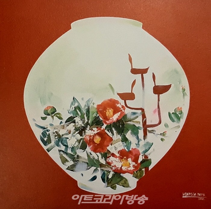<기원 21> 2021의 작품을 보면 정방형의 구도로 만물은 서로 조응하고 같은 과정을 되풀이한다. 흰 눈 속에서 피는 동백(지조와 절개)과 솟대, 달항아리 등의 소재로 눈과 마음을 자극하는 빨간색(영원과 불멸의 상징)에서 오는 생생함과 강렬함이 표현된다. 갈필(물기가 거의 없는 붓에 물감을 묻혀 칠하는 기법)과 번지기(이미 젖어 있는 종이에 색을 칠해 자연스럽게 번지도록 하는 기법) 등이 서로 대조를 이루며 환상적이고 몽환적인 분위기를 만들고 있다. 텅 빈 배경과 가득 채운 주제(달항아리, 동백, 솟대)로 상이한 두 세계의 대조화과 공존으로서 채움과 비움의 미학을 드러내고 있다.
