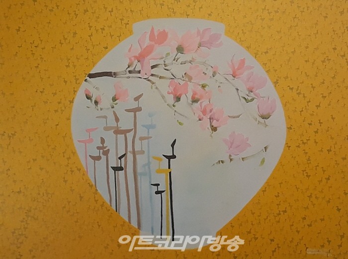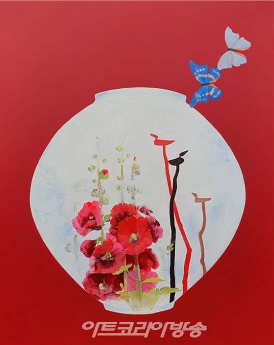 <기원 21> 2021의 작품은 배경에 시공간을 넘나드는 한 쌍의 나비가 날고 달항아리 안 접시꽃과 솟대가 자리 잡고 있다. 솟대는 추상적인 단색(평면)으로 처리하고 접시꽃은 안쪽을 어둡게 입체감이 묘사되고 다채로우며 화려한 색상이 특징인 담채 기법과 중간 색조를 이용하여 섬세한 표현이 돋보인다. 이때 인간의 마음속에 그린 이미지는 실제로 외부 세계에 현실화하여 나타난다. 달항아리 안팎으로 시공간을 초월한 듯 현실 세계가 아닌, 메타버스(3차원 가상 세계)의 세계를 표현하고 있다.