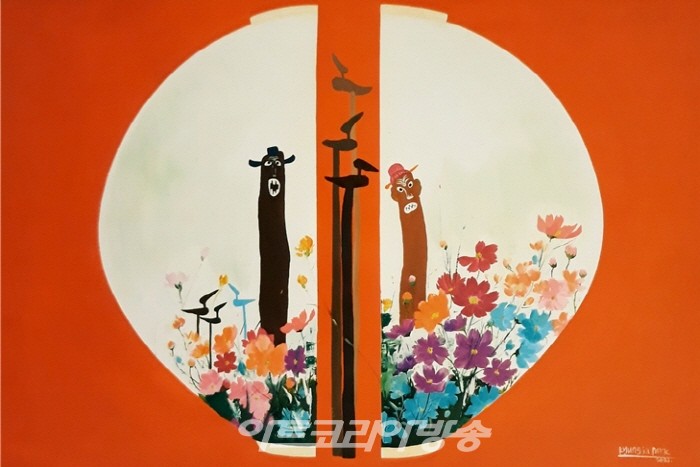<기원 21) 2021의 작품에서 보면 완전하지 못하는 반달처럼 서로 대립하는 이원화 된 세상 속에서 솟대가 그 중심에 있고 장승이 서로 떨어져 있다가도 자연의 섭리(코스모스)처럼 만남이라는 인연의 시간을 통해 서로 하나가 된다. 물체의 특징에 따른 붓질의 효과와 풍부한 색감이 돋보인다. 동양철학에서는 우주와 자연의 운행 원리와 법칙으로 보면 음양이 모이면 신(神)이 되고 음양이 소명하면 귀(鬼)가 된다고 본다. 동중서의 말처럼 천지의 기(氣)는 합해지면 하나가 되고, 나누어지면 음양이 되고, 쪼개지면 사시(四時), 나열되면 오행(五行)이 된다.