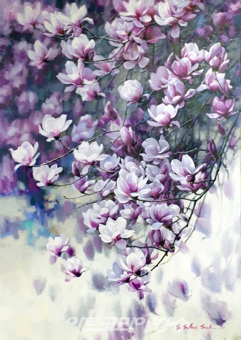 이어 "꽃은 봄의 정령인 치유의 개념으로도 예쁜 친구이고 흰색의 순수, 정열의 빨강, 고귀함의 바이올렛, 핑크의 고차원적인 사랑 등 색이 주는 상징성은 고유한 향기와 그 꽃의 의미를 더해서 누구나 마음 속에 꽃 한 송이를 피웠으면 좋겠고 꽃을 그리는 저는 행복한 사람"이라고 설명했다.