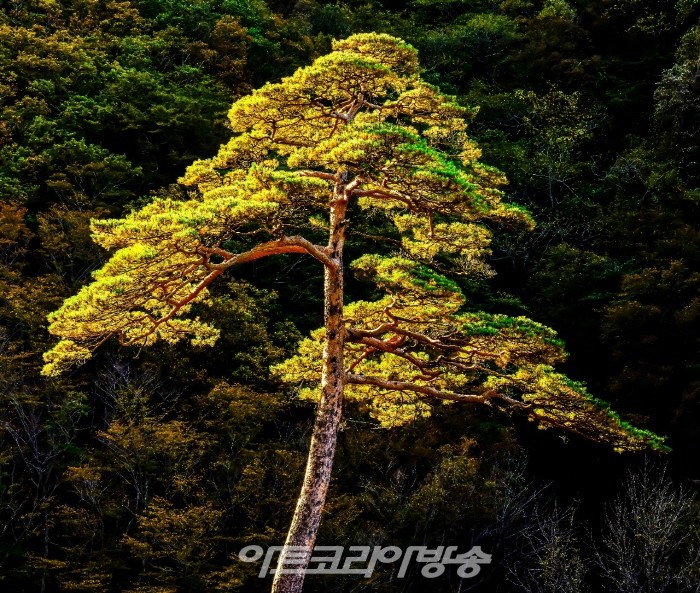 2018년10월 중순 가을 강원도 강릉의 외곽지로 피사체를 찾아 다니던 중 길옆 산기슭에 외롭게 한그루만 우뚝 서있는 소나무를 발견 촬영을 시작하니 동쪽에서 비치는 강한 가을햇살에 의해 서서히 2-3분간 황금색을 연출하더니 제자리로 돌아 갔습니다. 가을 겨울에는 사철나무인 소나무도 낙옆으로 떨어지며 그 잎이 노랗고 붉은색을 띄고 있습니다.