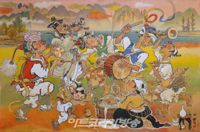 전통 농악은 풍성한 추수를 축하하는 행사로써 흥겹고 화목을 다지는 마당임으로 율동과 표정이 살아 움직이는 그림이어야 한다고 생각합니다. 더욱이 해학이 들어 있어야 작품에 가치가 있다고 생각됩니다.