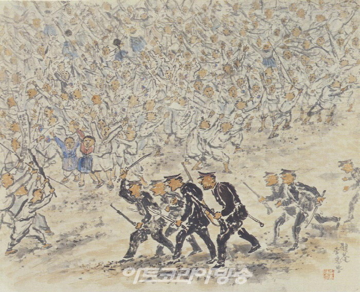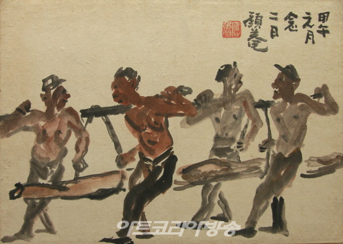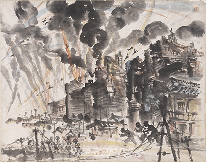 <6.25>(1950)는 전쟁을 기록한 이응노의 대표적인 작품이다. 하늘에 검게 솟구치는 연기 사이로 날아다니는 전투기와 폭격한 마을과 건물로 침입하는 무장군인을 볼 수 있다. 화면을 대각선으로 나눈 과감한 구도와 빠른 붓놀림으로 그려낸 폭약의 붉은 불꽃은 상황의 긴장감을 더욱 극적으로 보이게 한다. <판자촌>은 1953년 정전협정이 이루어지기 전 판자촌의 풍경을 그린 그림이다. 낡고 허름한 집들이 옹기종지기 모여 있으며 그 사이에 솥에 불을 때며 식사를 준비하는 사람들의 모습을 그렸다. <영차영차>(1954)는 전쟁의 피폐한 삶을 재건하고자 하는 사람들의 노력을 주제로 그린 작품이다. 큰 대들보를 든 4명의 노동자들이 함께 외치는 것 같은‘영차영차’는 세상과 마주한 삶의 건강한 노동을 말하고 있다. <영차영차>는 1956년 이응노가 저술한 미술수업교재인『동양화의 감상과 기법』의 목차 페이지에 소개되었다.