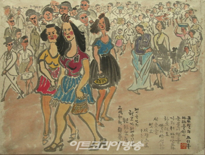 1939년에는‘죽사(竹史)’라는 호 대신‘고암(顧菴)’을 사용하기 시작했다. 광복 전 귀국한 이응노는 단구미술원(檀丘美術院) 결성에 참여하는 등 광복 이후 미술이 발전해 나가야 하는 방향을 모색하기도 하였다. 이후 재건하고 있는 사람들의 삶을 면밀히 관찰하여 표현하는 풍속화를 그리기 시작하였고, 이러한 특징은 1950년대 중반까지 살펴볼 수 있다. <공주산성>은 1940년 겨울에 그려진 작품으로 앙상한 가지와 메마른 낙엽들, 차분한 먹빛으로 그려진 산줄기가 마치 금방이라도 눈이 내릴 듯 가라앉은 겨울 산의 느낌을 잘 나타내고 있다. 서양 풍경화처럼 원근법과 사실적인 묘사, 맑고 담백한 색채와 경쾌한 붓놀림이 특징적이다. <양색시>(1946)는 미군을 상대로 유흥업에 종사하는 여성을 그린 작품으로 시대상이 반영된 풍자화이다. 오른쪽 하단에 이응노가 당부하는 말은 다음과 같다. “그대들의 자태를 바라볼 때 눈물이 앞을 가려 마지 않노라. 하루라도 빨리 반성하여 새 옷을 벗고 직장으로 제이 국민의 현모가 되어주기를 원하노라.”