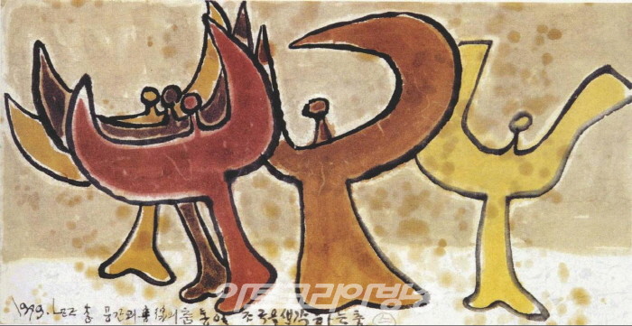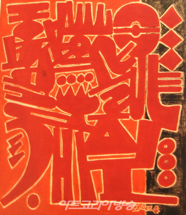 1975년에 제작된 <구성> 작품은모직에 다양한 채색으로 문자의 해체와 재구성을 가한 작품이다. 이응노는 고대문자를 서로 결합하고 다양한 형상으로 재창조하였다. 문자의 뜻과 상관없는 화면 구성이 되는가 하면 본래의 의미를 그대로 드러내는 경우도 있었다. 재료에서도 솜, 양털, 융, 부직포, 삼베, 모직 등을 사용해 작품을 제작했고 이렇게 제작된 작품들은 마치 벽에 거는 양탄자와 같은 인상을 남겼다. 모직에 그린 <구성>은 강렬한 붉은 색과 검은 먹의 대조가 눈길을 끌며 장식적인 효과가 강조되고 있다. 1979년에 제작된 <통일무>는 통일된 광장에서 환희의 춤을 추는 남북의 사람들을 그린 것이다. 남녀노소 구별이 없는 다중의 인간이 일정한 리듬과 방향성으로 추는 춤 그것을 이응노는 통일무라고 명명했다. 작품 하단에 이응노는‘공간의 춤, 선의 춤, 통일조국을 생각하는 춤’이라는 서명을 남겼다.
