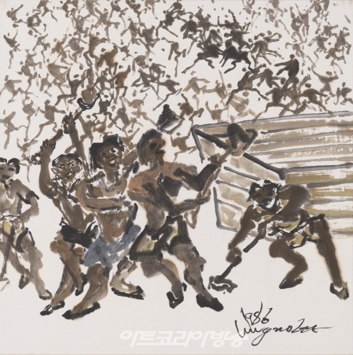 인간의 삶에 대한 관심과 관찰은 1960년대부터 인간의 형태로 화폭에 등장하며, 1980년대에는 군집을 이룬 인간상으로 나타난다. 특히 1980년 5월 광주에서 일어난 민주화운동에서 보였던 자유를 희망하는 사람들의 움직임은 <군상> 시리즈로 평화를 갈망하는 마음과 함께 이응노 예술세계가 집약되어 있다. 세계 곳곳에서 종교, 민족, 인종, 계급 등의 갈등으로 고통을 겪는 이들에게 많은 공감과 위로를 전했다. 한편 국적이 한국이어서 활동에 많은 제약을 받았던 이응노와 부인 박인경, 아들 이융세는 1983년 프랑스 귀화를 선택했다. 1989년 1월 서울 호암갤러리에서 개인전이 개최되었고, 그달 10일 이응노는 파리에서 심장마비로 타계했다. 1984년에 그린 이응노의 <군상>은 태양을 향해 한 줄기 선에 매달려 오르고 있는 인간의 모습을 대각선의 간결한 구도를 그려낸 작품이다. 태양이라는 강렬한 대상, 불가능을 향하는 인간의 추구가 매우 상징적으로 드러난다.