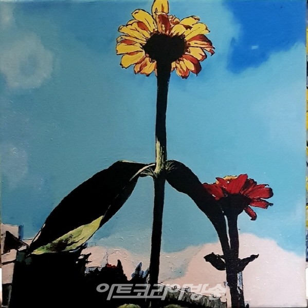 꽃밭 가득 바람에 파도처럼 흔들리는 수많은 꽃들 중에서 우연히 몇송이에 눈길이 머물게 되고 나에게는 특별한 존재가 되어 내 그림의 소재가 되어준다. 무더운 여름. 나는 꽃이 내게 주는 청량한 자유로움을 살짝 붓에 묻혀서 나를 그 속에 넣어본다.