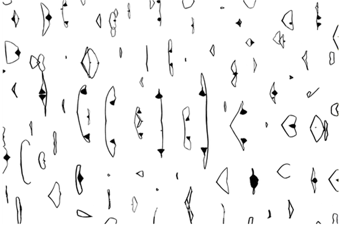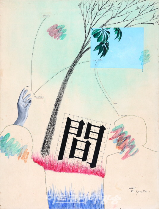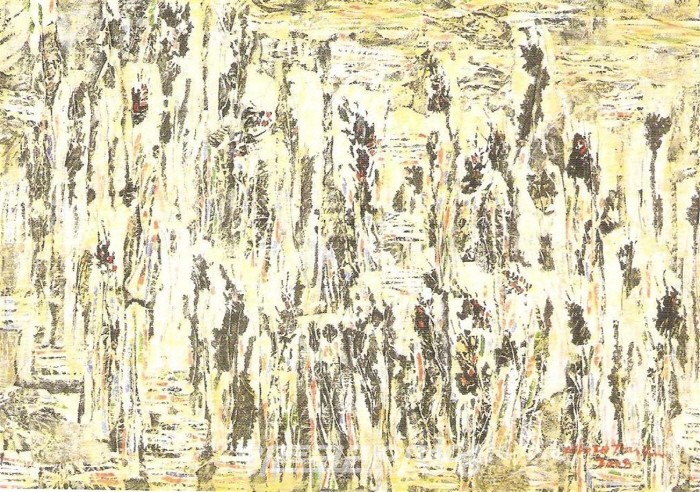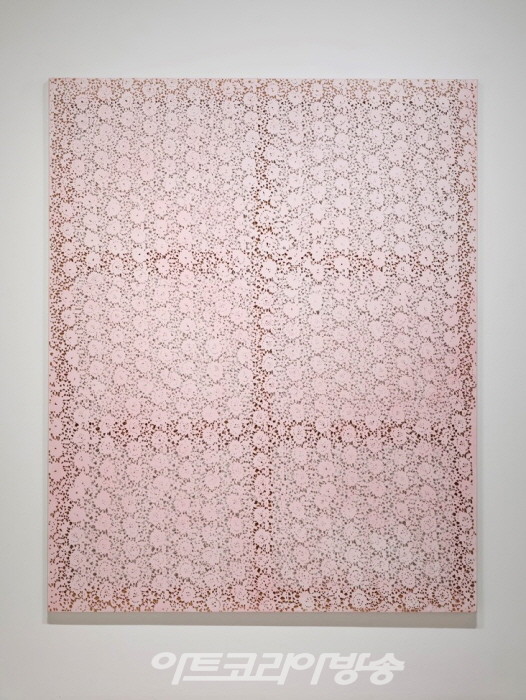 김영배(1947-2001 )작가의 ”무제“ 시리즈 형상적 이미지와 기하학적 패턴과 같은 언어의 조합으로 반복된 패턴으로 화면을 구성한다.