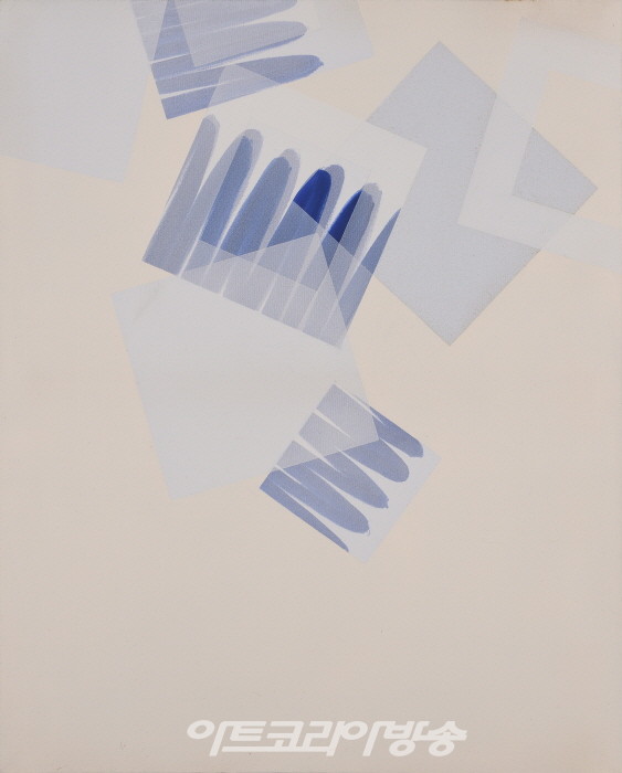 김재관 작가의 기하학적 추상미술 반세기 작품 중 80년대 ‘관계’ 시리즈는 지속과 조형적 레퍼토리가 등장하게 되는 시기로 캔버스 화면에 무정형의 반복된 획과 사각면의 중첩이 시작을 보여준다. <Relationship-1980~1981>은 백색 톤의 미세한 칼라의 사각 앵글과 코발트블루 붓질(劃)의 반복된 겹침이 평면으로 중첩된 구조로 이루어져 있으며, 이후 컴포지션과 재료의 사용 방법이 조금씩 변하면서 지속된다.