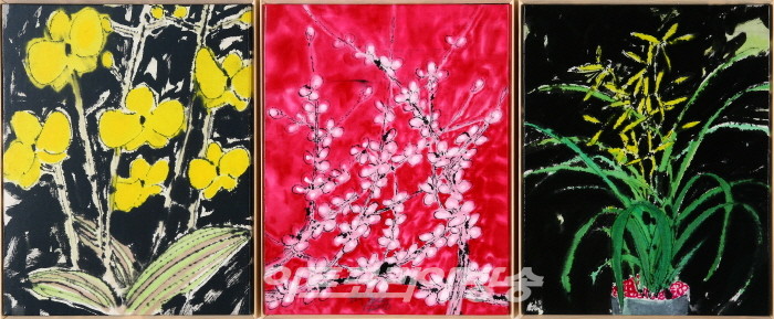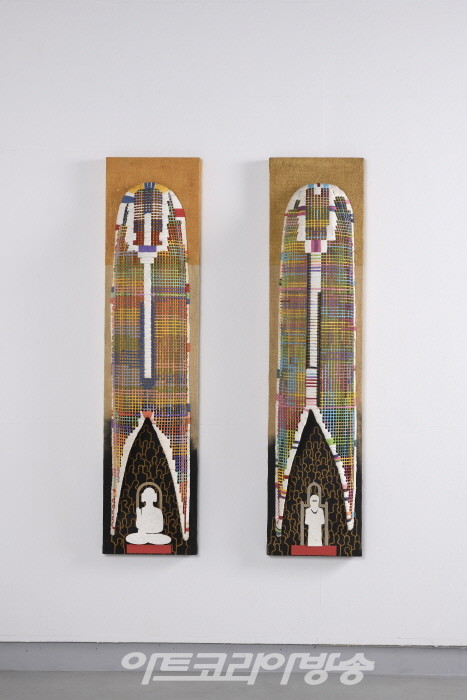 정명희 작가는 대지의 기운이 농축되어 있는 편경의 이미지를 중심으로 새 그리고 물의 흐름이나 파동에 연결되는 흘러내리는 선들로 짜이는 구성을 보인다. 오방색, 무지개를 연상하게하는 채색은 대지의 기운을 발산한다.