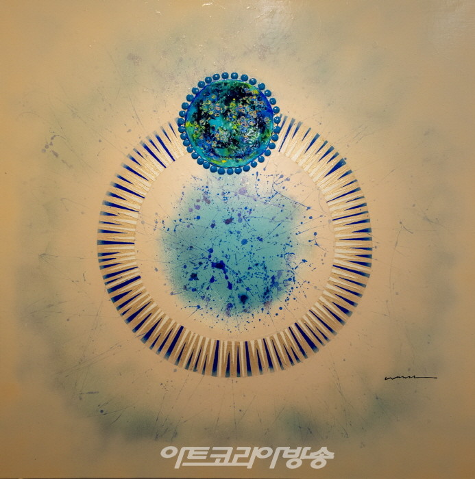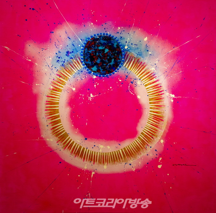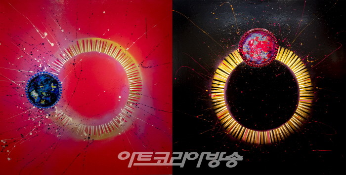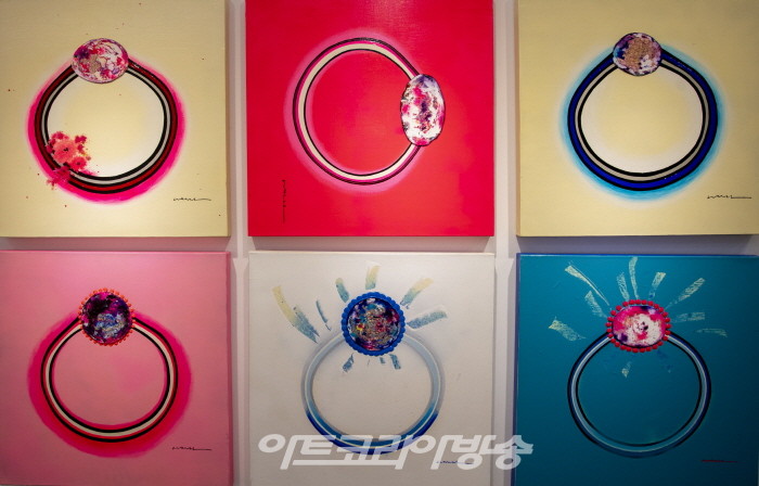 작품 설명에서 나 작가는 “행복한 빅뱅의 행복한 반지가 탄생됐습니다. 칼라들은 다양하게 연출을 해봤고요. 이렇게 나온 반지 알은 파렛트에서 나온 것도 있고 제가 또 하나하나 동그랗게 해서 만들어 내기도 했습니다.