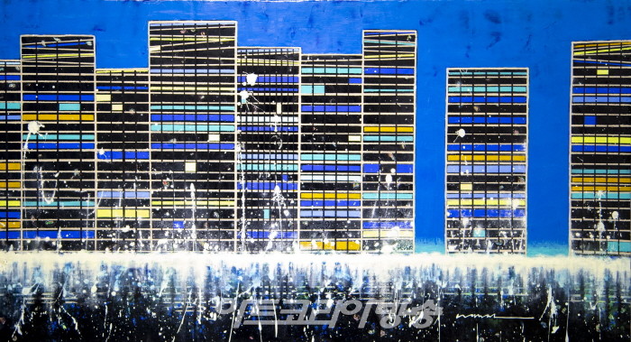 여러분들 함께 보여드렸으면 더 좋았을 텐데 그래서 이렇게 나온 것들은 이 밑 작업을 하면서 나이프로 긁어내는 부분도 있고 또 그냥 이런 형광빛으로 와 닿는 그런 작품도 있고, 이것도 가운데는 돌려도 보고 그렇게 연출을 했다.”고 설명했다.