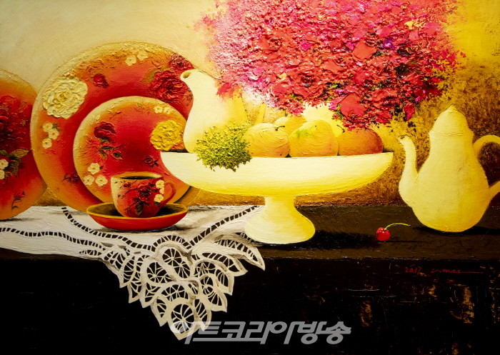 작품 설명을 부탁하자 나 작가는 “뒤에 보는 작품은 빅뱅의 환타지아입니다. 여기 자세히 보시면 아시겠지만 제가 조금 전에 말씀드렸던 창조된 그런 기법들이 군데군데 있습니다.