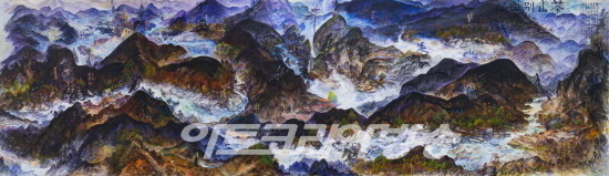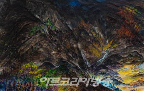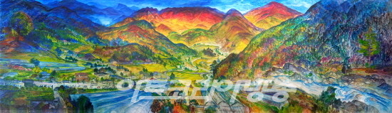 리얼리스트로서 길종갑은 자신의 태생지이자 유년을 보냈으며 지금은 팔순 노모를 모시고 고추, 배추, 토마토 농사를 짓고 사는 '구곡 전설'의 이곳을 그린다. 이번 전시에 내보인 곡운구곡도 계열로 볼 수 있는 작품은 <화음동기華陰洞記>(2011), <청람산靑嵐山>(2011), <곡운전도谷雲全圖>(2015) 정도인데, 이를 포함해 2011~2015년 사이 집중적으로 그려진 60~70여점의 구곡도들을 일괄해 말해본다면 한마디로 이 땅의 내력과 역사, 풍모와 영성(靈性)을 드러내 보려는 시도로 볼 수 있을 듯하다. 그러나 내력과 역사라하여 매우 근엄한 표정을 지닌 무엇이리라는 예상과는 거리가 멀다. 언뜻 보면 '삼각지 그림'인 듯 보이는 찬란한 색조로 관객의 시선을 잡아끄는 이 그림들은 유쾌함과 페이소스(pathos)의 밀고 당기는 역학이 작동하는 장이 되고 있다.