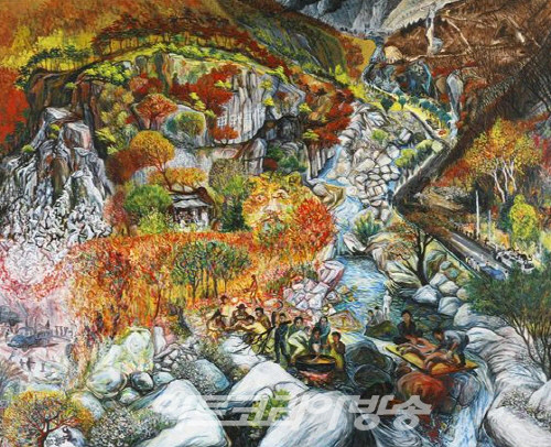 그런데 잘 보면 그것은 실경산수이다. 서양화 물감으로 그려진 고원법 평원법 심원법이 잘 구사된 동양화적 실경일 뿐만 아니라 하나의 그림 안에서 갓을 쓴 선비가 길을 지나가며, 현대의 관광객이 관광투어를 하고 있기도 하다. 또한 장쾌한 풍경화로 어김없이 간주할 수밖에 없는 대폭의 그림 앞에서 오래 세세히 보지 않으면 필히 놓치고야 마는 화면 귀퉁이 어느 한쪽에는 산을 파헤치는 공사가 벌어지거나 이미 완공된 터널과 고가도로를 통해 승용차가 질주하고 있기도 하다. 군데군데 숨은그림처럼 자리한 '흠집'들. 이 흠집들의 양상을 파악하기 위해 우리는 현미경을 필요로 한다. <화음동기華陰洞記>를 보자. 화음동은 김수증이 정치적 고난을 피해 은거한 길종갑 자신의 마을을 경유하는 사내면 삼일리, 사창리 계곡 일대에 대한 명명이다. 그러나 애닯은 정조는 겨우 그 이름에나 희미하게 남아있을까. 화음동의 수목은 유난히 밝은 원색으로 반짝이며 이산, 저 계곡 각각들은 부분들은 있되 전체는 없다는 듯이 화면 안에 저마다 할거(割據)하고 있어 화면은 파열되기 일보 직전이다. 이제 그 안으로 더 들어가 보면, 거기에 최소한 사람 130명, 차 12대, 경운기 1대, 오토바이 2대, 트렉터 1대는 물론 웅크린 형상이나 서 있는 인골(人骨)이 화석화된 바위나 암벽으로 그려져 있음을 알 수 있다. 곡운구곡 중 3곡에서부터 9곡까지 조망할 수 있다는 <청람산> 정상 꼭대기에는 삿갓 쓴(아마도 김시습을 지칭하려는 듯) 고대인을 뒤따라 오른 두 사람의 현대인 등반객이 있으며, 그 그림 중경(中景)의 현대식 교량 양켠으로는 고대인과 현대인이 나란히 늘어행렬 또한 발견하게 된다.