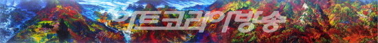 <풍속도-산치성山致誠>(2009)을 읽는다. 왼편 하단, 아마도 6.25 전쟁의 상흔인 듯한 '학살'의 장면이 있다. 바위란 바위는 거의 인골이 석화한 것이며, 강제노동과 살인, 학살, 발가벗겨진 사람들, 공포, 동물도살이 행해지고 있다. 그러나 그것들은 거의 눈에 띄지 않을 음화들로 그러하다. 그러나 아무리 첫눈엔 식별되지 않는다하더라도 결국엔 이내 알아차리게 된, 명랑하고 찬란한 빛 속에 폭발적인 색들로 제 존재를 뽐내는 만산홍엽의 비경은 결국 처참하고 어둡기 그지없는 인간들의 날것의 생의 가면에 지나지 않은 것임을 어쩔 수 없이 드러내고 있다. 자연을 말하는 듯하지만, 결국 인간 세계의 흔적의 층을 얘기하고 있는 것에 다름 아닌 것이다. 따라서 독자가 맞는 사태는 결국 이 그림의 주제는 무엇이다!고 꼬집어 말할 수 없게 된다. 말하자면 형식을 이탈하는 어떤 표현, 그저 '표현'에만 자신의 몫은 할당됐을 뿐이라는 듯 작가는 그림을 어떤 '수행(修行)'적 행위로 질러놓고 떠나왔기 때문이다. 천지신명(天地神明), 세상의 모든 생명체와 사물은 이미 신에 속해 있음을 예증할 뿐이었기에 화면의 경계가 어디에 있고 한 사물의 생과 멸은 그 자체로 생과 멸인가? 강렬한 회의를 드러낸, 그런 도치된 경험들의 변신(變身) 이야기가 길종갑 그림이 들려주는 이야기이다.