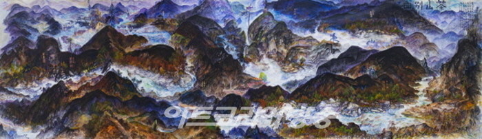 리얼리스트로서 길종갑은 자신의 태생지이자 유년을 보냈으며 지금은 팔순 노모를 모시고 고추, 배추, 토마토 농사를 짓고 사는 '구곡 전설'의 이곳을 그린다. 이번 전시에 내보인 곡운구곡도 계열로 볼 수 있는 작품은 <화음동기華陰洞記>(2011), <청람산靑嵐山>(2011), <곡운전도谷雲全圖>(2015) 정도인데, 이를 포함해 2011~2015년 사이 집중적으로 그려진 60~70여점의 구곡도들을 일괄해 말해본다면 한마디로 이 땅의 내력과 역사, 풍모와 영성(靈性)을 드러내 보려는 시도로 볼 수 있을 듯하다. 그러나 내력과 역사라하여 매우 근엄한 표정을 지닌 무엇이리라는 예상과는 거리가 멀다. 언뜻 보면 '삼각지 그림'인 듯 보이는 찬란한 색조로 관객의 시선을 잡아끄는 이 그림들은 유쾌함과 페이소스(pathos)의 밀고 당기는 역학이 작동하는 장이 되고 있다.