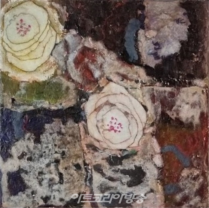 강명순 작가: 꽃을 이미지화 하여 재료에 대한 물성과 감각으로 느끼며 사유하는 꽃. 강하고 거친 생명력 표현한꽃. 편안하고 위로 받는꽃. 더불어 함께 함축적인 우주인 꽃에서 가치와 에너지를 주고 받으면서 공유하고 싶습니다.