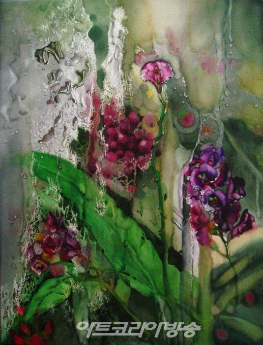 성에와 유리창을 적시며 흐르는 물과 물방울은 우리들 삶의 단면을 은유하고 눈물과 슬픔, 애수, 아픔, 혹은 그리움과 같은 감정과 연루되고 있다고 할 수 있습니다. <人生>이라는 명제에서 감지할 수 있듯이 인간 삶에 비유하고 있는 것이죠. 현실과 이상, 슬픔과 희망이 교차하는 이중구조의 내용임을 알 수 있듯이 성에가 녹아 흘러내리는 유리창은 현실이고 그 안쪽에 자리한 꽃은 이상일 수도 있습니다. 꽃이라는 소재를 중심으로 하면서도 꽃이 가지고 있는 아름다움보다는 내용을 표현하는데 더 큰 의미를 두고 있고, 시각적인 즐거움을 주는 아름다운 그림도 나름 의미가 있으나 그림이 우리들 삶에 대해 진지하게 생각할 수 있는 기회를 제공하는 것은 또 다른 의미가 있습니다.