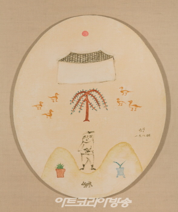 전시명 <꽃이 웃고, 작작 鵲鵲 새가 노래하고>는 장욱진 수필집 <강가의 아틀리에>의 한 구절로 “꽃이 웃고, 작작 鵲鵲 새가 노래하고 봄비가 내리는 그런 곳에 참 부처의 모습이 있는 것일까. 그림도 그런 것일까. 작작 鵲鵲”의 구절에서 인용한 것으로 세상 만물이 조화를 이루는 세상을 꿈꾸고, 작품에 담고자 했던 장욱진의 세계관을 엿볼 수 있다.