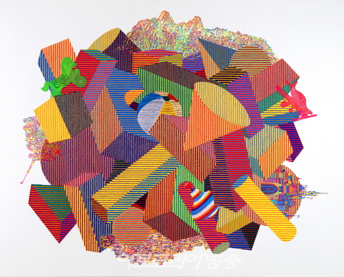 미스터리 서클을 지구인이 인위적으로 제작했으리라 사람들이 감히 염두에 둘 수 없었던 데에는 광활한 곡물 평지에 새긴 기계처럼 찍은 정교한 문양의 스케일 때문이었다. 권성원의 그림을 도판으로 확인하면 얼핏 캔버스 천이나 종이 위에 색실로 꿰맨 직물 공예로 오해하기 쉽다. 실물을 가까이서 확인하면 비로소 컨베이어 벨트 위에 그림을 얹고 기계로 형형색색을 순차적으로 찍어낸 듯 한 절제미가 그림에서 느껴지는데, 정작 이 작업은 작가가 콤프레샤와 튜브로 제작한 수공품이다. 콤프레샤와 연결된 에어건을 쥔 왼손과 물감 튜브를 쥔 오른손이 호흡을 맞춰 동기화된 결과물이란 얘기다. 캔버스 위에 일직선으로 균일하게 그어진 물감의 줄은 가까이서 보면 물감 튜브를 쥔 오른손의 미세한 힘 조절로 균일하게 꿈틀꿈틀 이어지면서 물감의 재질감을 살리고 있다. 균일한 물감 굵기와 길이를 한 줄 한 줄 쌓아 완성에 이르는 이 노동집약적인 제작법에서 흡사 중세시대 모자이크 제작 공법을 떠올리게도 된다.